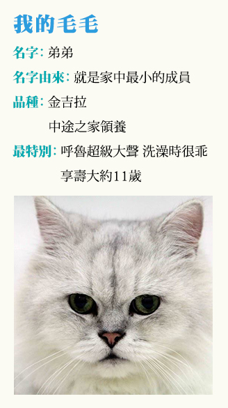 2009年我開始領養五歲的他,謝謝弟弟陪我六年,他的早逝我要負全部的責任,在他對我發出不舒服訊息時,我還誤會他是跟我鬧脾氣,是我延誤他就醫的黃金時間。如果真有輪迴來生,希望我可以變貓讓投胎成人的弟弟來領養我。嗯,不好,當貓奴很辛苦的,弟弟還是留在天堂,不要再來到紛擾的人間。