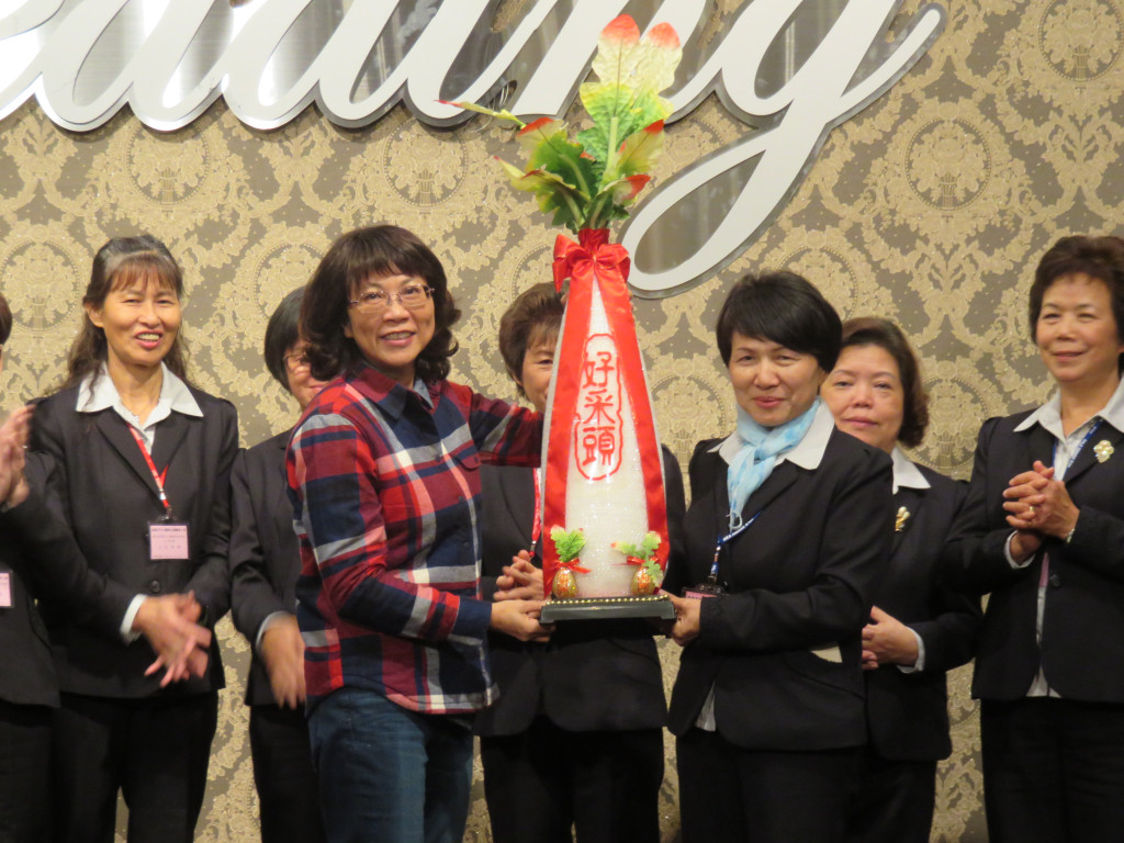 王如玄今(27)日晚間到基隆市長榮桂冠酒店參加「基隆市手工藝製品業職業工會」會員代表大會後餐敘,較預計時間晚半小時左右抵達,一到場即受到該會代表熱烈歡迎,她也露出開心的笑容並與理事長擁抱。王如玄致詞後也獲贈好彩頭及粽子,與會人士並高喊「凍蒜」祝她高票當選。