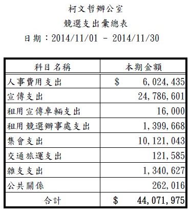 台北市長柯文哲今(31)日由前競選總幹事姚立明宣布第三波選舉經費,總支出為1億4100萬元,總收入為1億3800多萬元,柯文哲日前指稱最後一個月「失控」的花費為8585萬5621,就如他所言,最大筆的支出為「宣傳支出」。