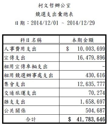 柯文哲兌現選前承諾,今天由姚立明舉行「柯文哲競選經費公布記者會」,公布最後二個月競選經費,去年11月1日至30日支出4407萬1975元,12月1日至29日支出4178萬3646元,二個月共支出8585萬5621元。