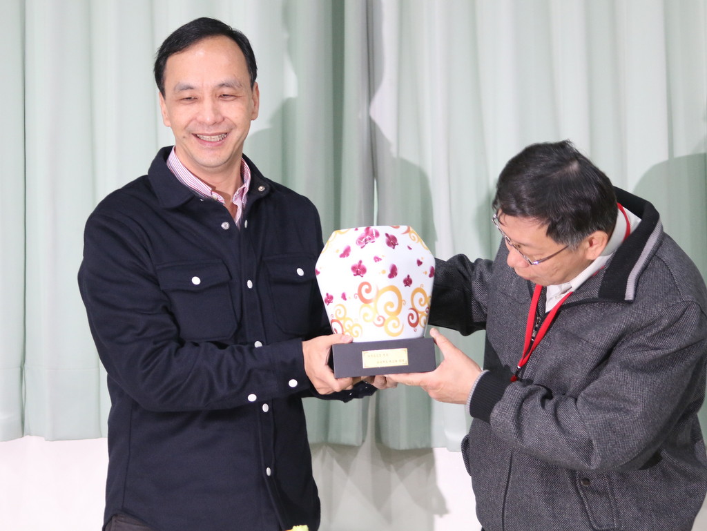 朱立倫贈送天燈造型檯燈時,柯文哲彎腰查看正面。