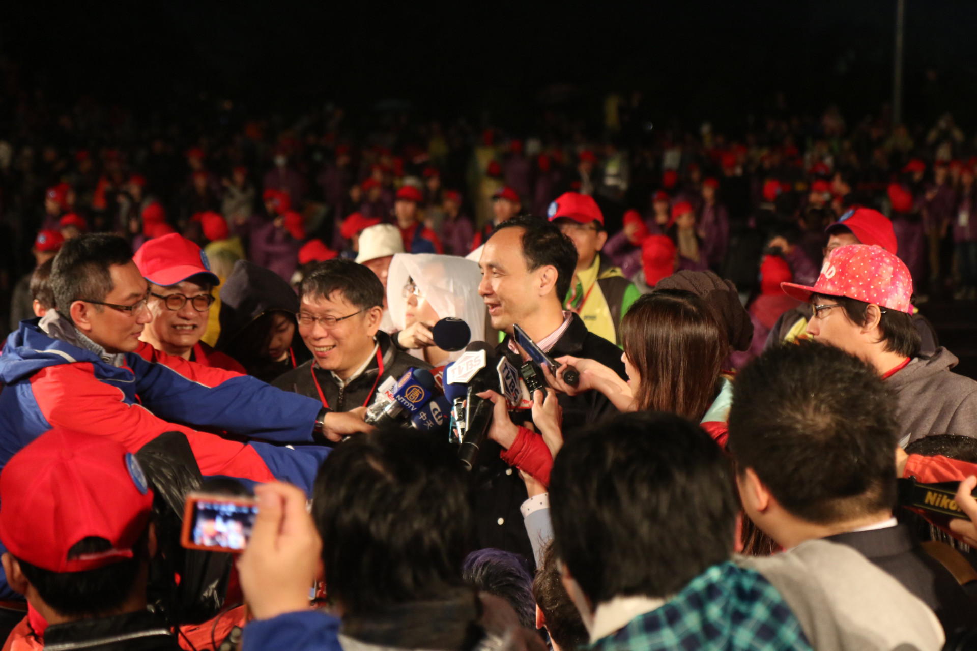 柯文哲放完天燈後與朱立倫一起受訪,柯露出靦腆笑容。