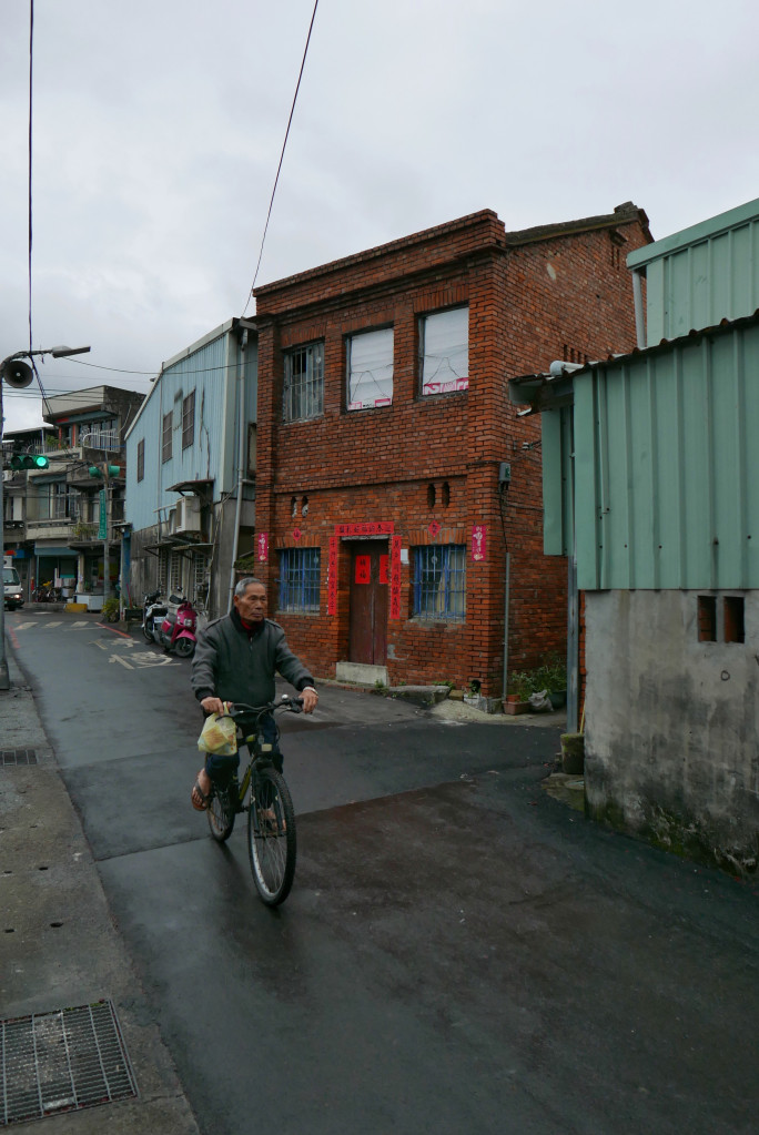 阿伯騎著腳踏車,手把上還掛著火腿蛋三明治及奶茶,這裡是社子島以前最熱鬧的地方,叫做「店仔口」。