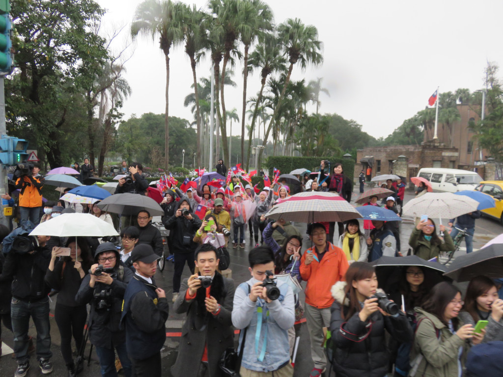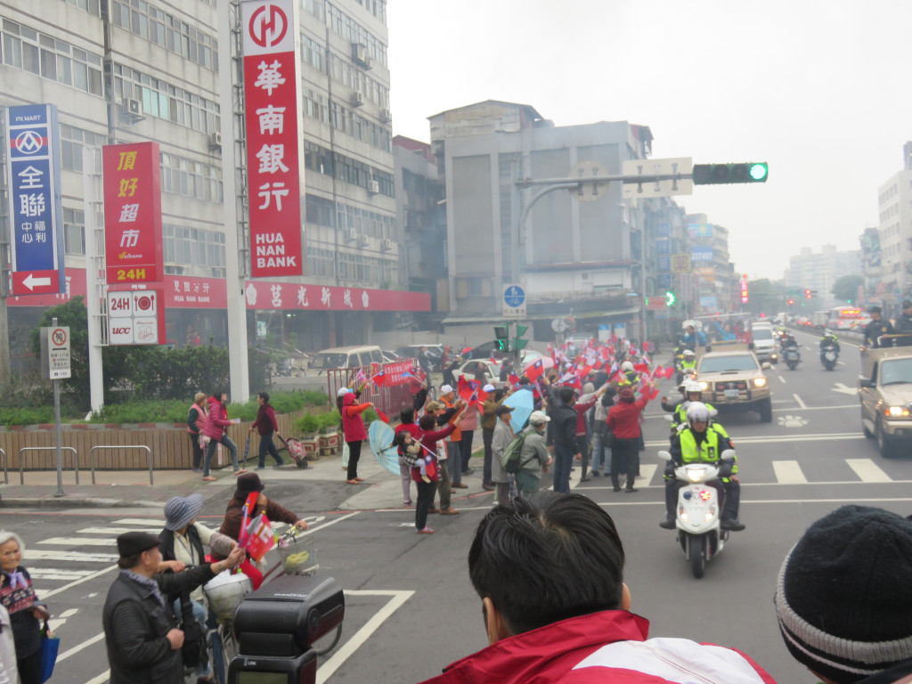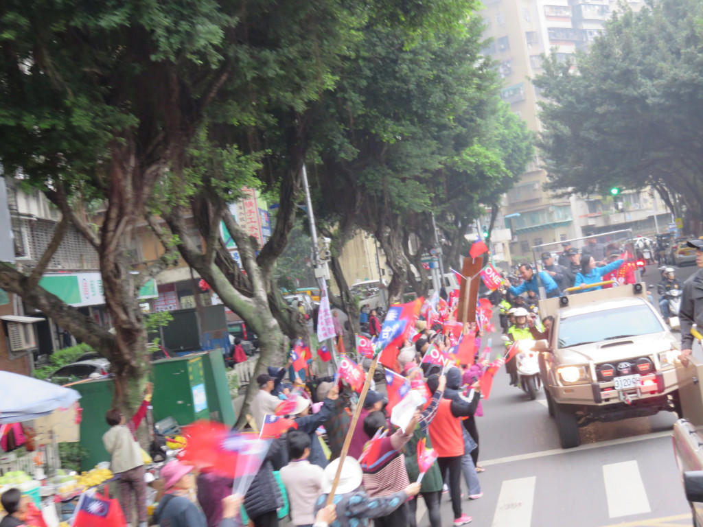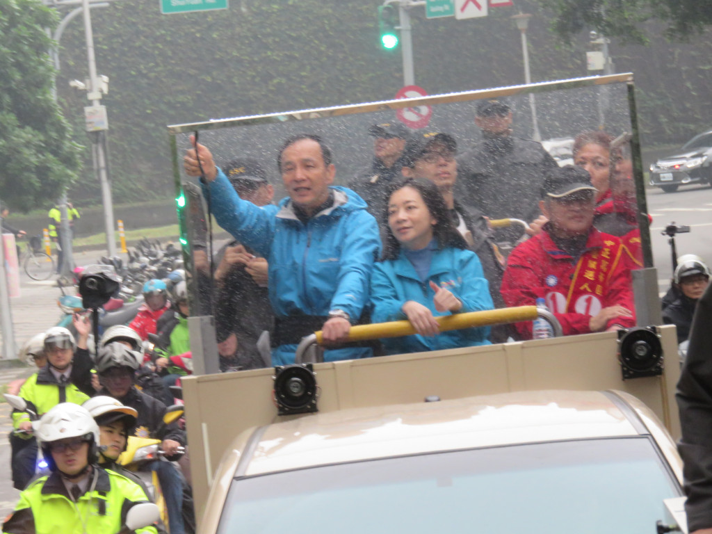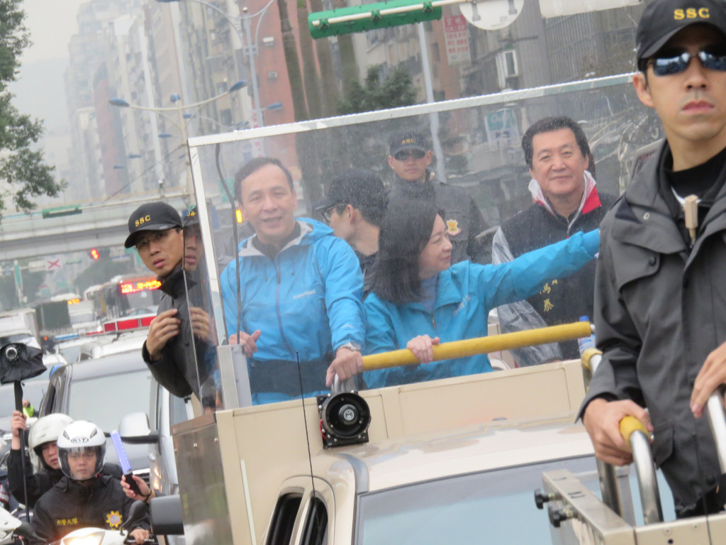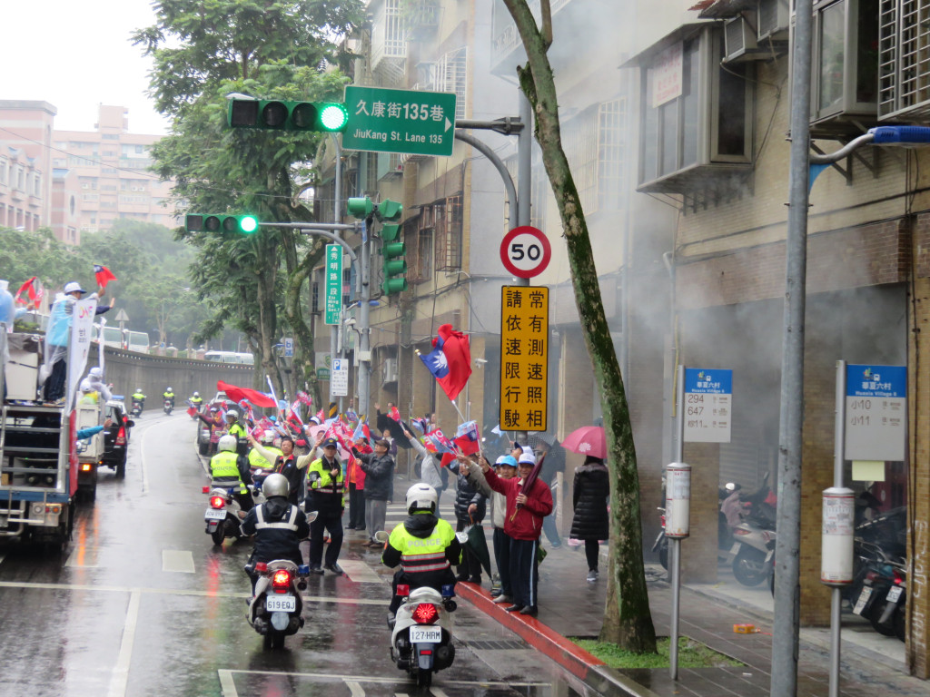 朱的車隊離開中正萬華進入大安區,蔣乃辛已在和平西路等候,車隊經東門一帶的信義路再經新生南轉到忠孝東路,路上難得出現比較多的揮手人潮,比激戰區要熱些,但不如軍宅國宅社區;到了世貿對面,選情一樣相對穩定的費鴻泰上車後,天空雨勢漸大,而費的動員能量相對不如大安區的蔣乃辛。