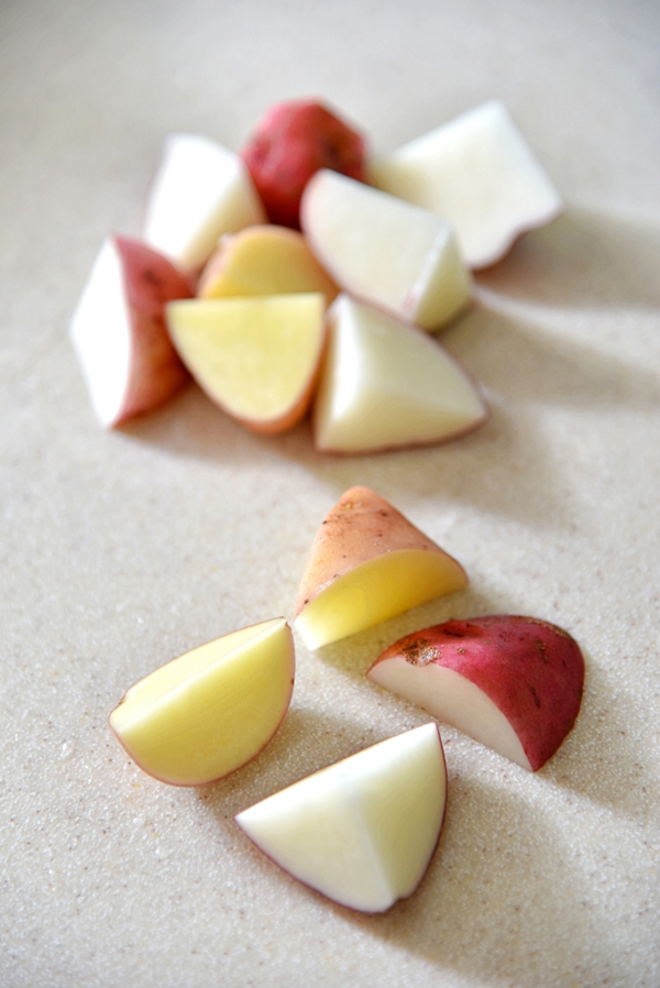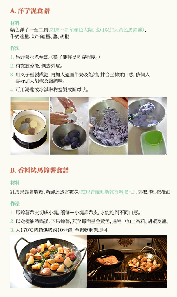 ・馬鈴薯品種相當多,這兩種都是紅皮,深淺程度不同,肉色一黃一白。以「烤」的方式烹調,肉質鬆軟綿密,