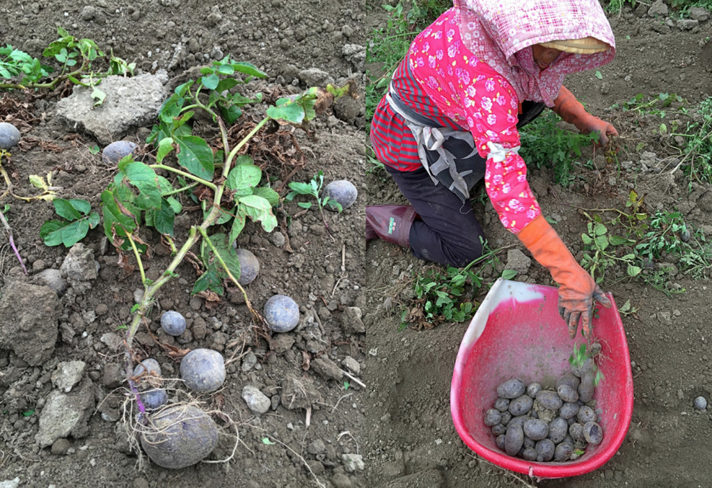 ・究竟是石頭還是馬鈴薯?採收紫色馬鈴薯需要好眼力((左,游惠玲攝)。