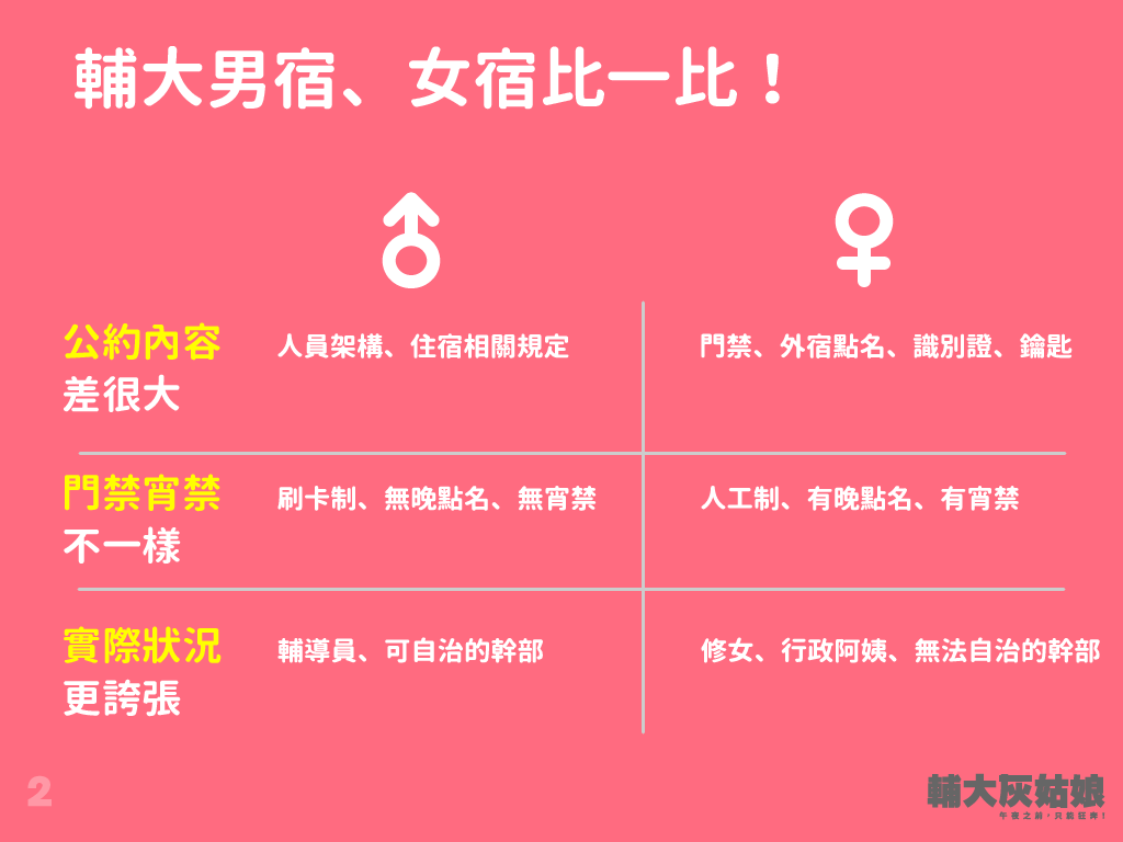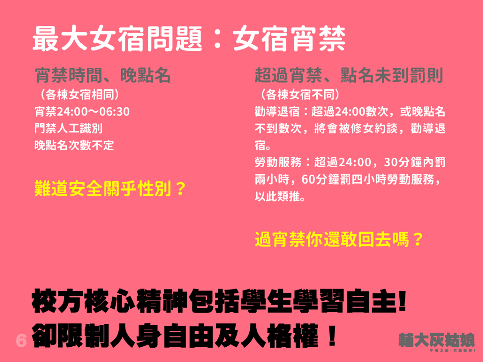 沈清楷批評,男宿可以「沒有門禁、電子刷卡、自治幹部」,為何女宿不行?這就是性別差別待遇,女宿甚至還有「晚點名」,超過半夜12點,30分鐘內罰勞動服務2小時,這種軍事化管理,不適合現代民主化校園。