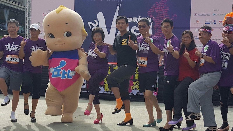 勵馨基金會與新北市府合作的「男人有淚我最愛,V-Men路跑」活動當中,形象超「man」的戰神黃國昌、長跑名將林義傑高跟鞋,體驗女性平日感受。圖/黃辦提供