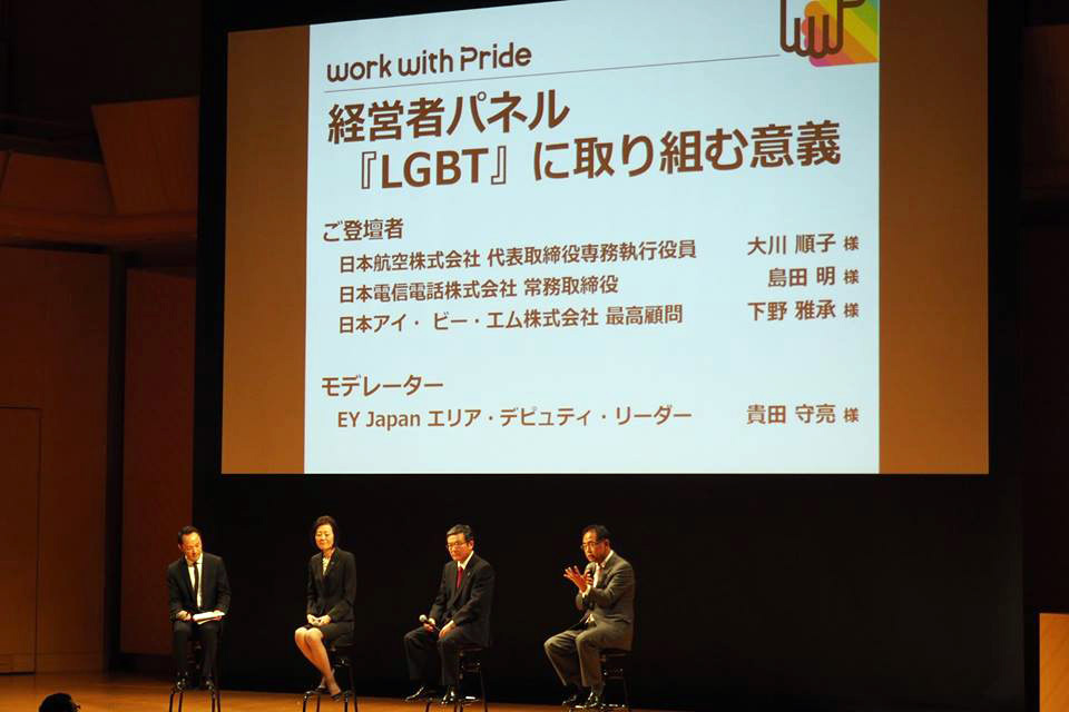 不僅如此,現在日本今年還對能改善LGBT工作環境及條件的企業頒獎,這是由「work with Pride(wwP)」等團體所舉行的,從當事人的感受、啟發運動、人事制度及企劃、對外活動及社會貢獻、環境等,建立Pride指標,選出表現優秀的企業,也就是期待企業能善待LGBT,今年就有83個大企業參加角逐,結果是像樂天在每個樓層都加設與性別無關的多目的廁所等,或是日本微軟等則不時舉辦LGBT相關活動,促進理解。在頒獎當天也有日本NTT常務董事島田明、日航代表暨常務董事大川順子等都參加,表示今後這樣的活動非常重要,而必須促進溝通來增加對LGBT存在的認識。