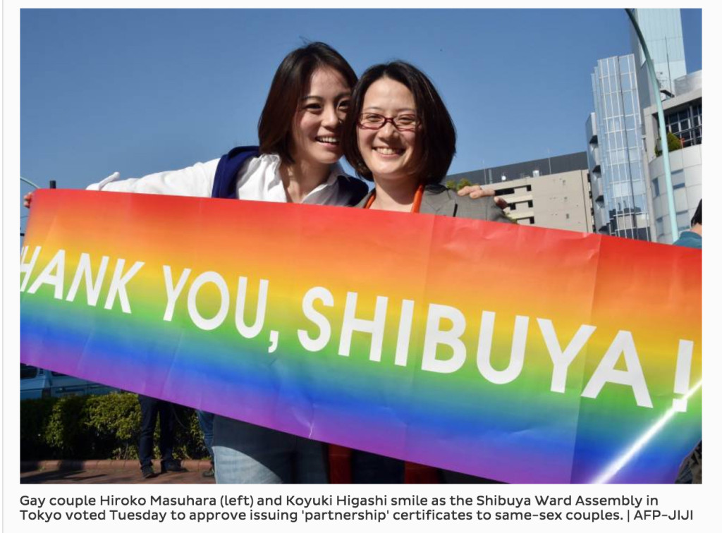 近年有關彩虹族人權的革命性步伐不斷跨出,尤其是2015年東京都的澀谷區率先通過同性伴侶條例,而且是除了自民黨等3名議員以外絕大多數的贊成通過的,給予LGBT發給跟結婚證書有同樣效率的「伴侶證書」等;同年8月,東京都世田谷區區長保坂展人宣佈LGBT只要提出成為伴侶宣誓書,該區就會發出接受宣誓書證明的受領書,因為該區沒通過條例,因此只能以區的「要綱」來處理;同樣2015年兵庫縣寶塚市也同樣制定了要綱,對提出伴侶宣誓書的LGBT發給受領書。
