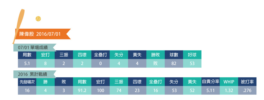 5.1局被打8安、失4分,三振、四壞各2次,單看這些數據,當然覺得陳偉殷成績極不理想。不過,若將豪雨中斷及牛棚放火等因素排除在外,他今日表現並不太差。被打3支長打,其中有2支落點奇佳,只歎運氣不好。而他在主力武器失靈後的應變能力也值得稱許,所有變化球種只被擊出1安,拿到10個出局數;快速球則被打7安,竟比6個出局數還多。