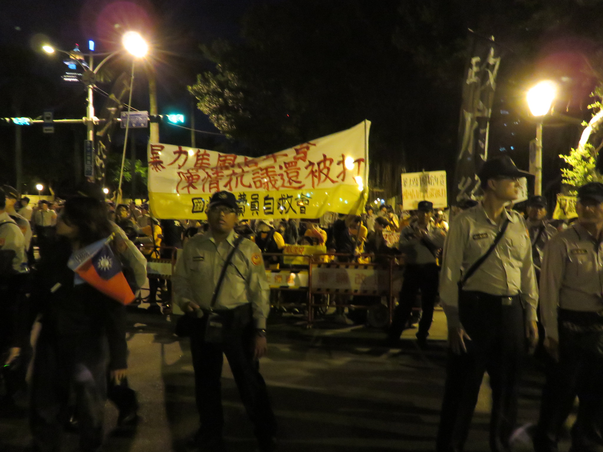 (下圖:國道收費員在連勝文演講時一度衝進現場抗議,場面火爆,拉布條男子事後被拖走)