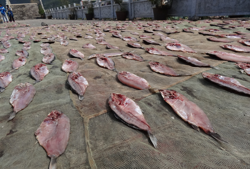 洱海漁村裡曝曬中的魚乾。