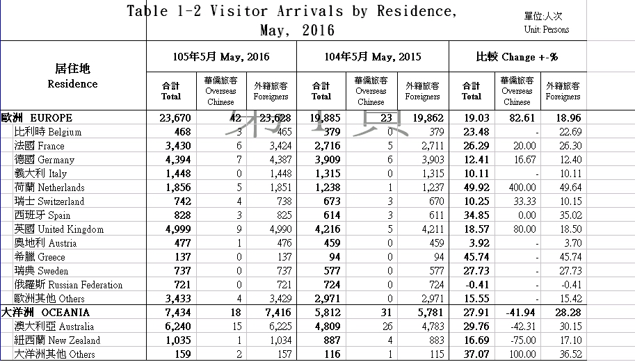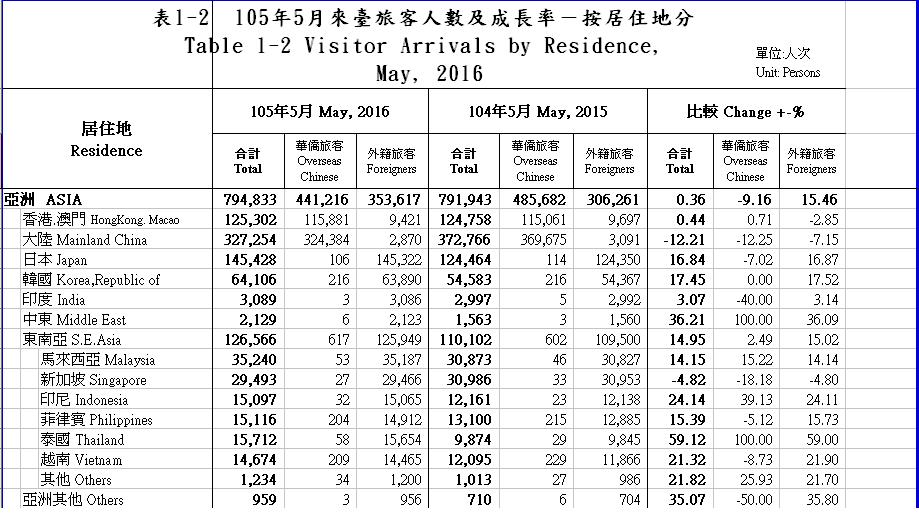 根據觀光局最新統計資料顯示,比對去年和今年5月的外國旅客來台數增減,其中中國客減少12.21%、日本增加16.84%、韓國增加17.45%,歐洲遊客也增加19.03%,直逼兩成大關,而且整體而言觀光人次還增加1.87%。
