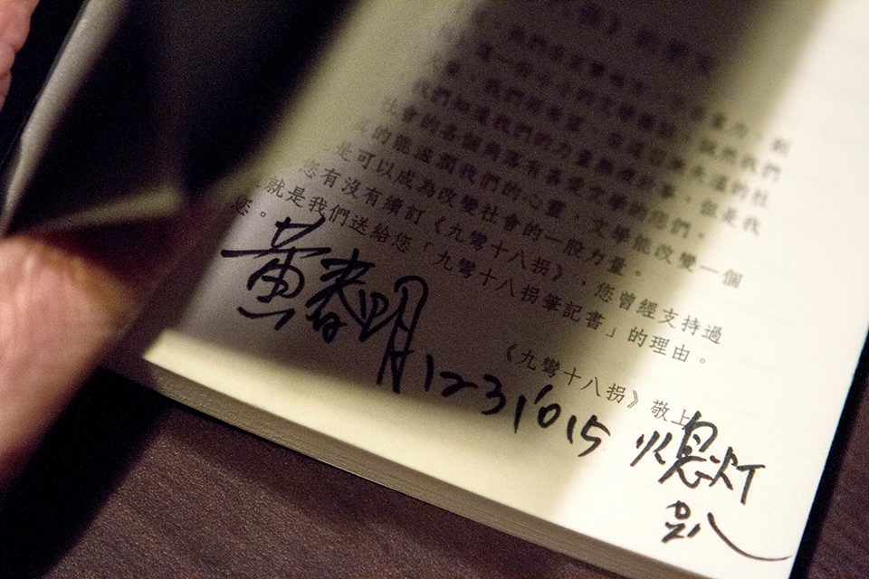 黃春明為讀者簽下熄燈趴的簽名。(楊文卿攝影)