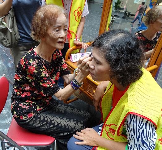 林梅蘭阿嬷替志工劃彩𥺁,猶是精神貫注,仔細漂亮。(中華民國失智者照顧協會提供)