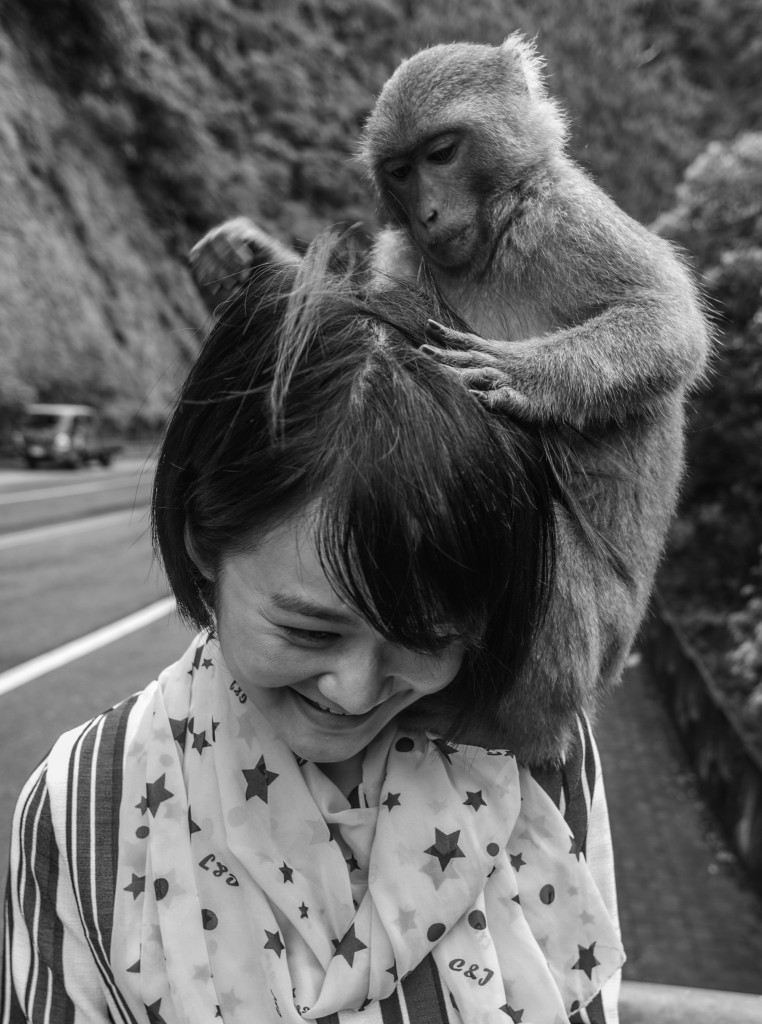小猴兀自玩髮「理毛」,表露親密情感,投以高度信任。