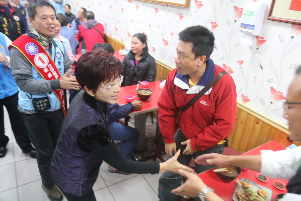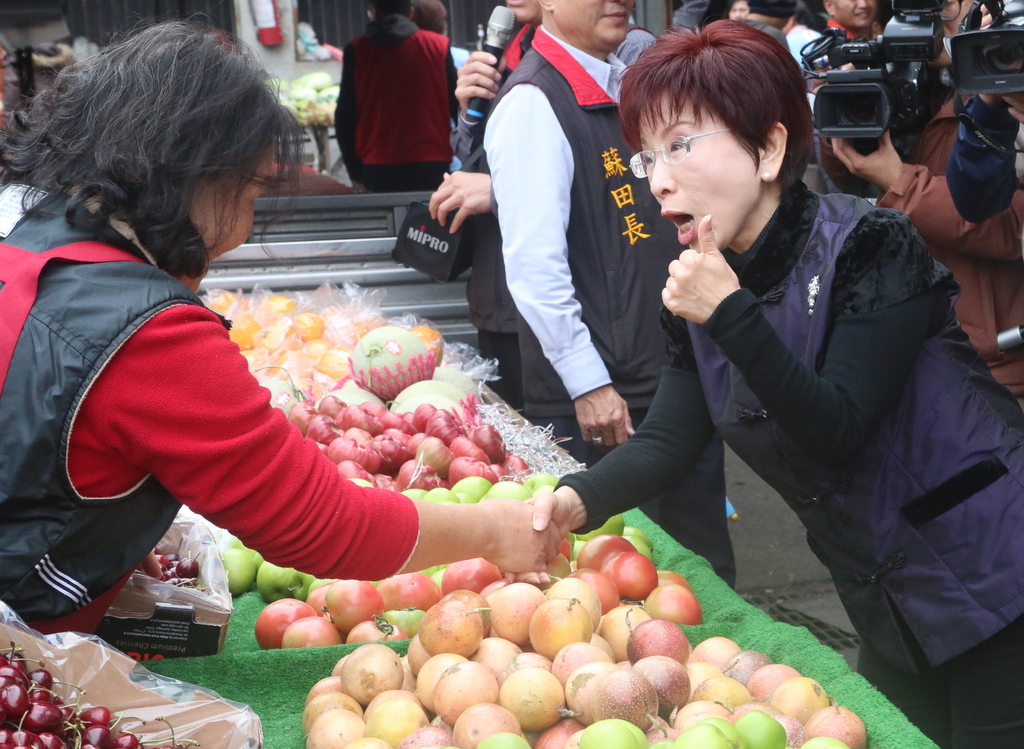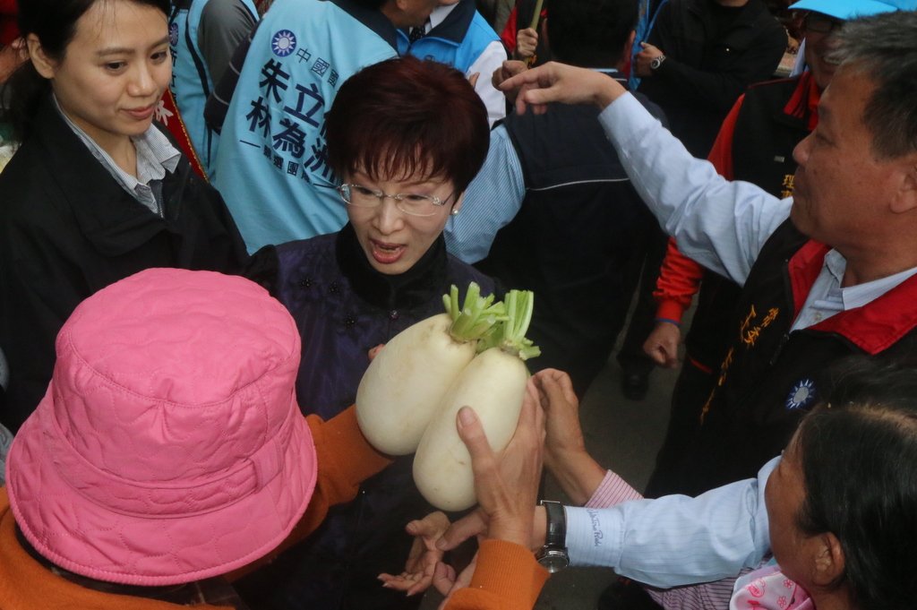 「柱柱姊」洪秀柱下午則陪同林為洲到湖口地區徒步拜票,在眷村鐵票區逐門握手,洪秀柱再度展現高人氣,許多仰慕者爭相合影,拉抬鄉親對林為洲的支持熱度,走進勝利路菜市場時,許多小販當場送上橘子、白蘿蔔、粽子等吉祥物,為選舉搏得好彩頭。