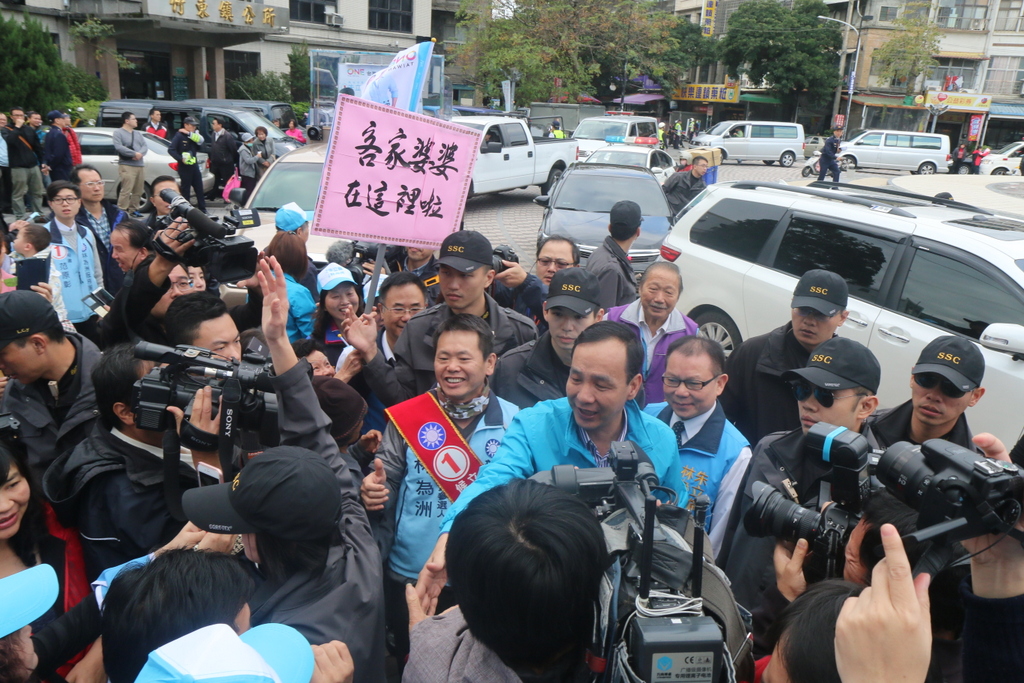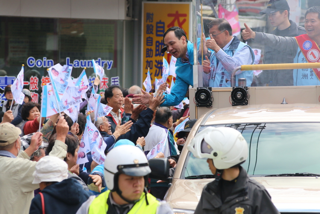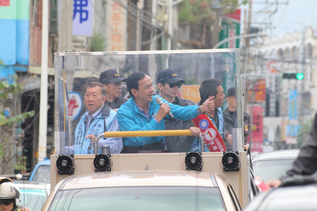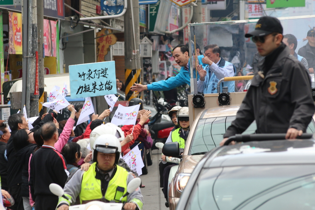 朱立倫在車隊遊街時,許多民眾揮舞旗子追到車邊,朱立倫也頻頻探出身子,與民眾擊掌、握手。民眾也高舉「阿婆在這裡」、「客家婆婆在這裡!」、「阿婆挺你啦!」的牌子表達支持;朱立倫、林為洲也笑容滿面,對新竹縣市的選情也更有信心。