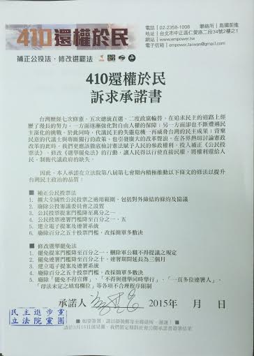 島國前進發起人陳惠敏教授說,發起410還權於民活動,期盼能內外呼應,除鼓勵支持修法的委員,同時檢視不尊重民意的立委,日後將發起落選運動。
