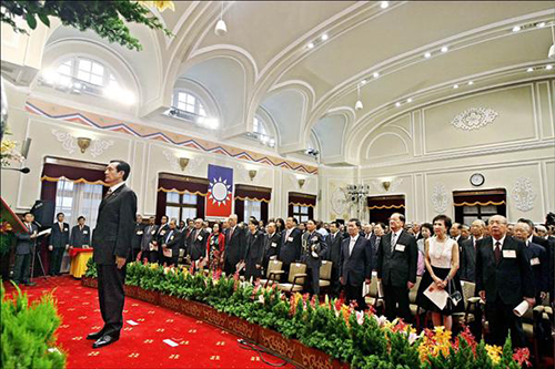 多年來台灣國内跡象,也明示國民黨早就迎合中國主子意願。二〇一二年馬英九總統就職典禮,室内牆壁上沒掛青天白日滿地紅的國旗,懸掛的是紅藍色調變造的黨旗(圖二)。