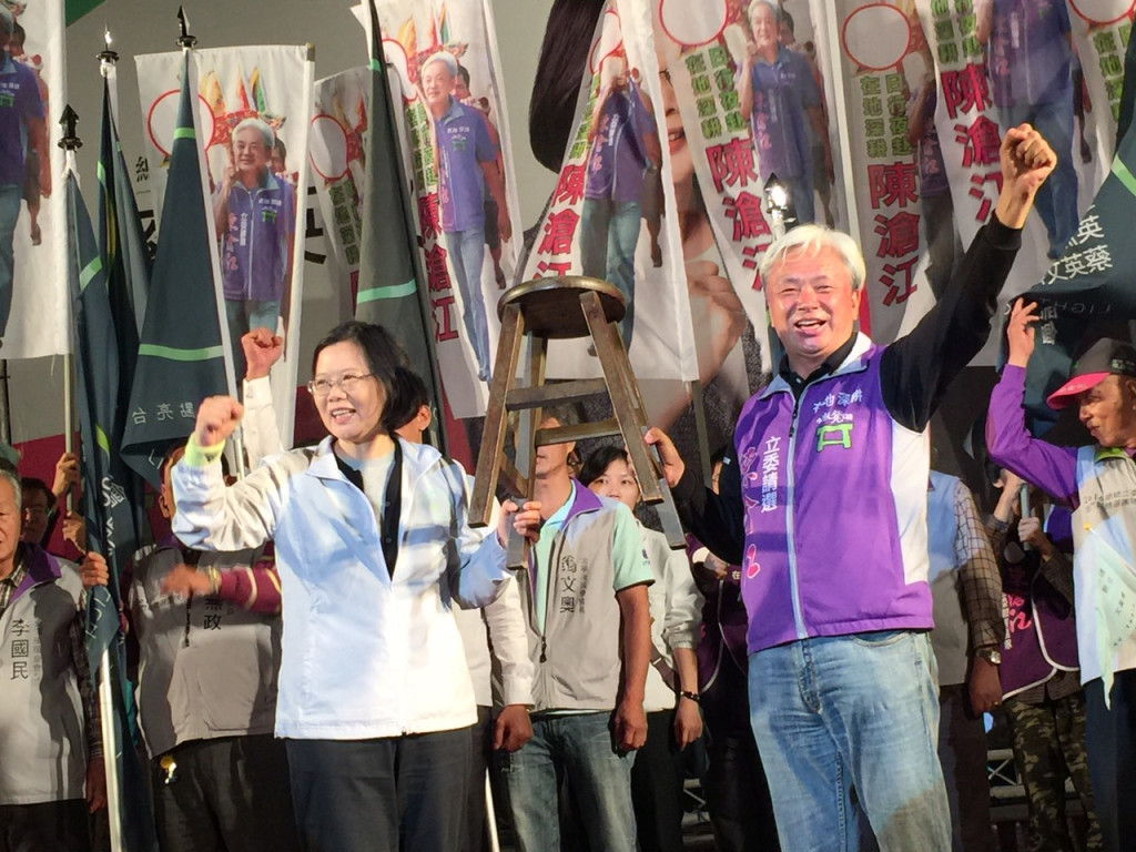 返鄉耕耘20餘年的陳滄江,以一張「綠色小板凳」為訴求,懇請鄉親給他側身議會的機會,蔡英文說,「小板凳的故事」也說明民進黨在追求民主改革過程中一個卑微的訴求,兩人並高舉小板凳,期盼鄉親再給一次機會。