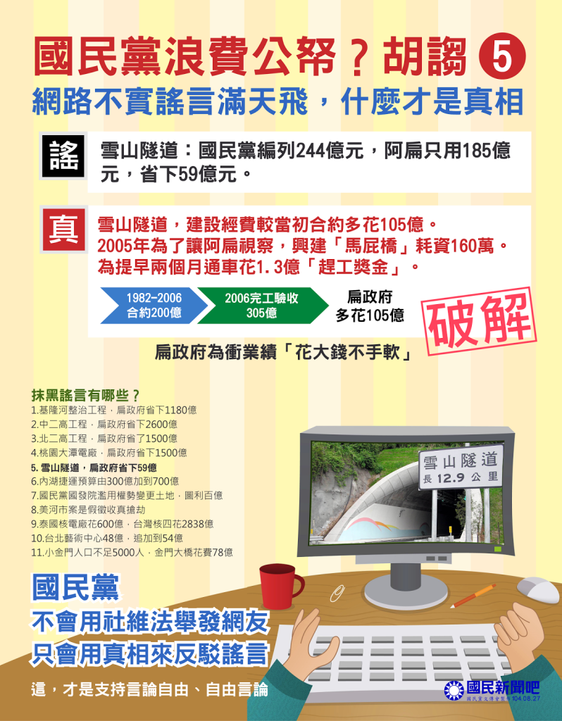 中國國民黨文傳會近來不斷發動文宣攻勢,宣稱長期來深受網路謠言攻訐、抹黑國民黨執政成果,如「貪污的阿扁幫國庫省下了6,839億」,要以「真相」駁斥假象,前行政院長游錫堃今(9)日淡定嘲諷「謝謝你們一直重提阿扁和我的政績!」。