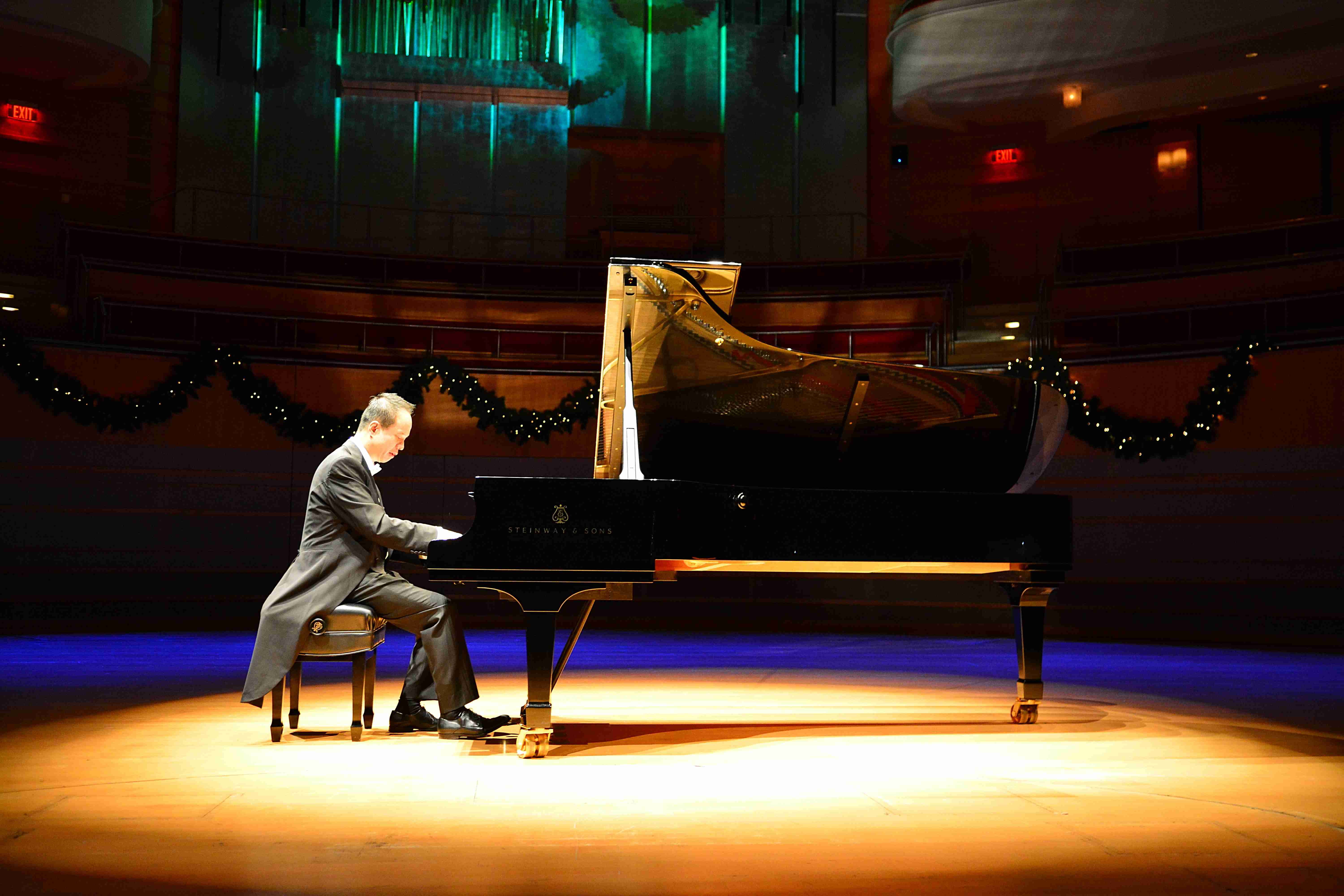 陳瑞斌在美國南加州著名的 Renée & Henry Segerstrom 大演奏廳專場鋼琴獨奏會時神情。(照片由陳瑞斌提供)