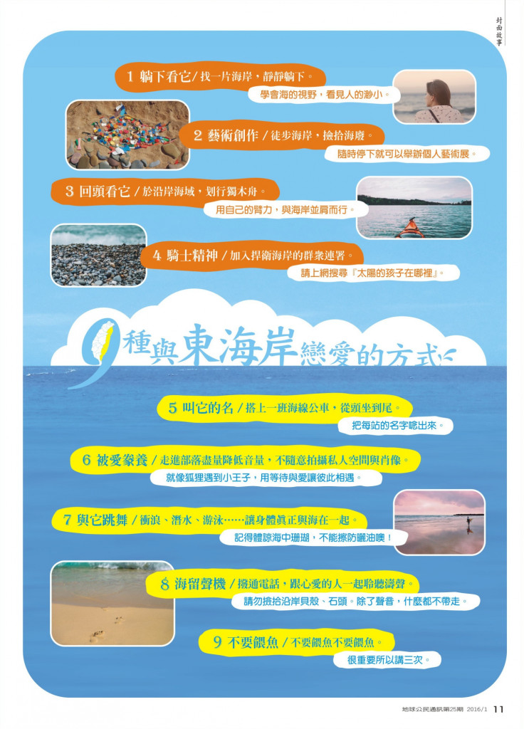 地球公民基金會訪談了三個不同角色的東海岸住民,看看他們真實的生活、聽聽他們心底的扎掙,了解這片美麗海岸潛藏的哀愁。至於,傾慕海岸風景與氣息的「過客」們,也提供九種與她戀愛的方法。