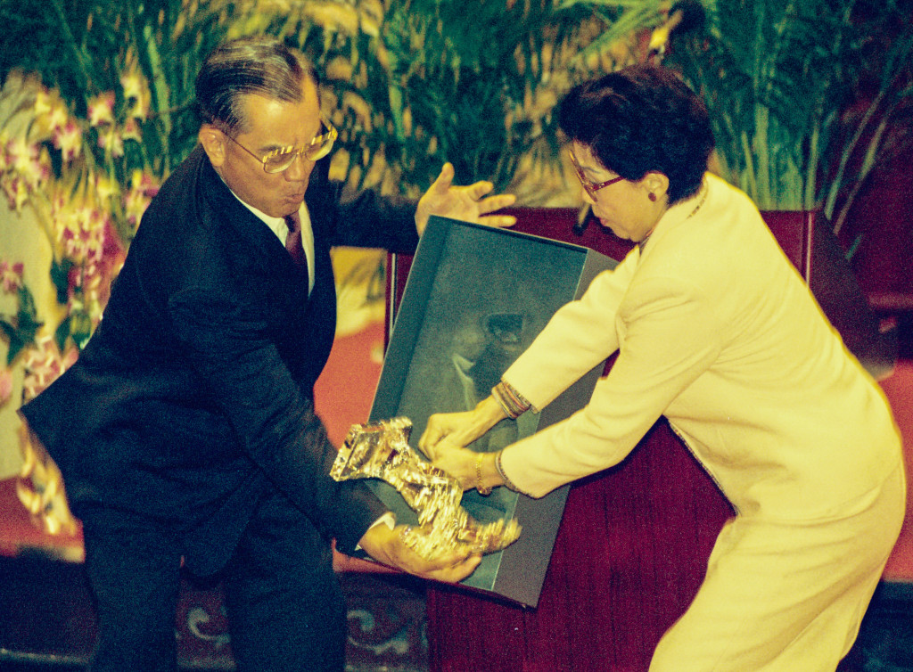 1997年時任副總統連戰免兼行政院長歡送會上,政務委員郭婉容(右)致送水晶馬賀禮,不慎從禮盒中掉落,見連戰倏忽間擺出單邊下勢,身手矯健,隨即將「脫韁野馬」制伏,解除危機。